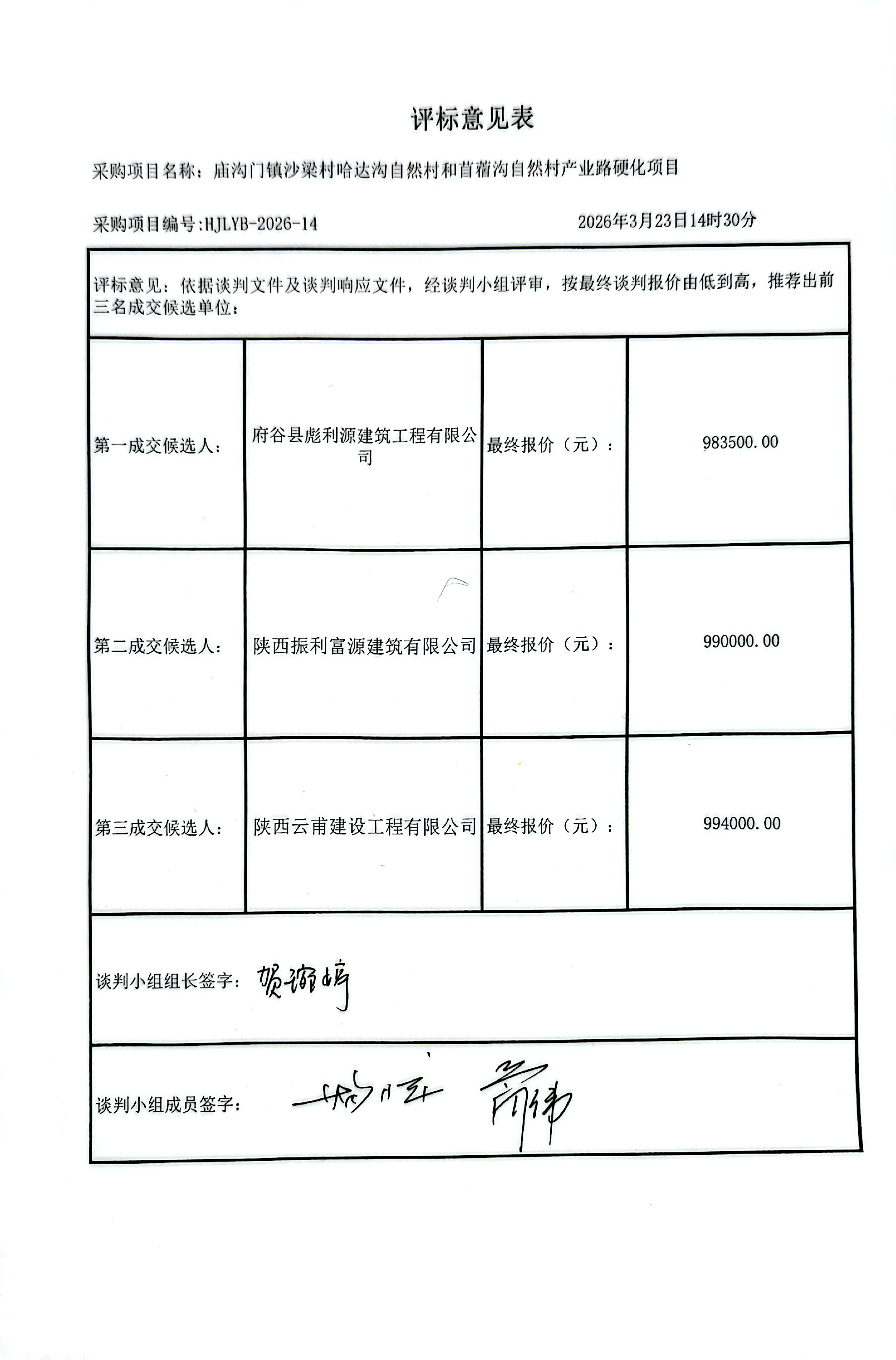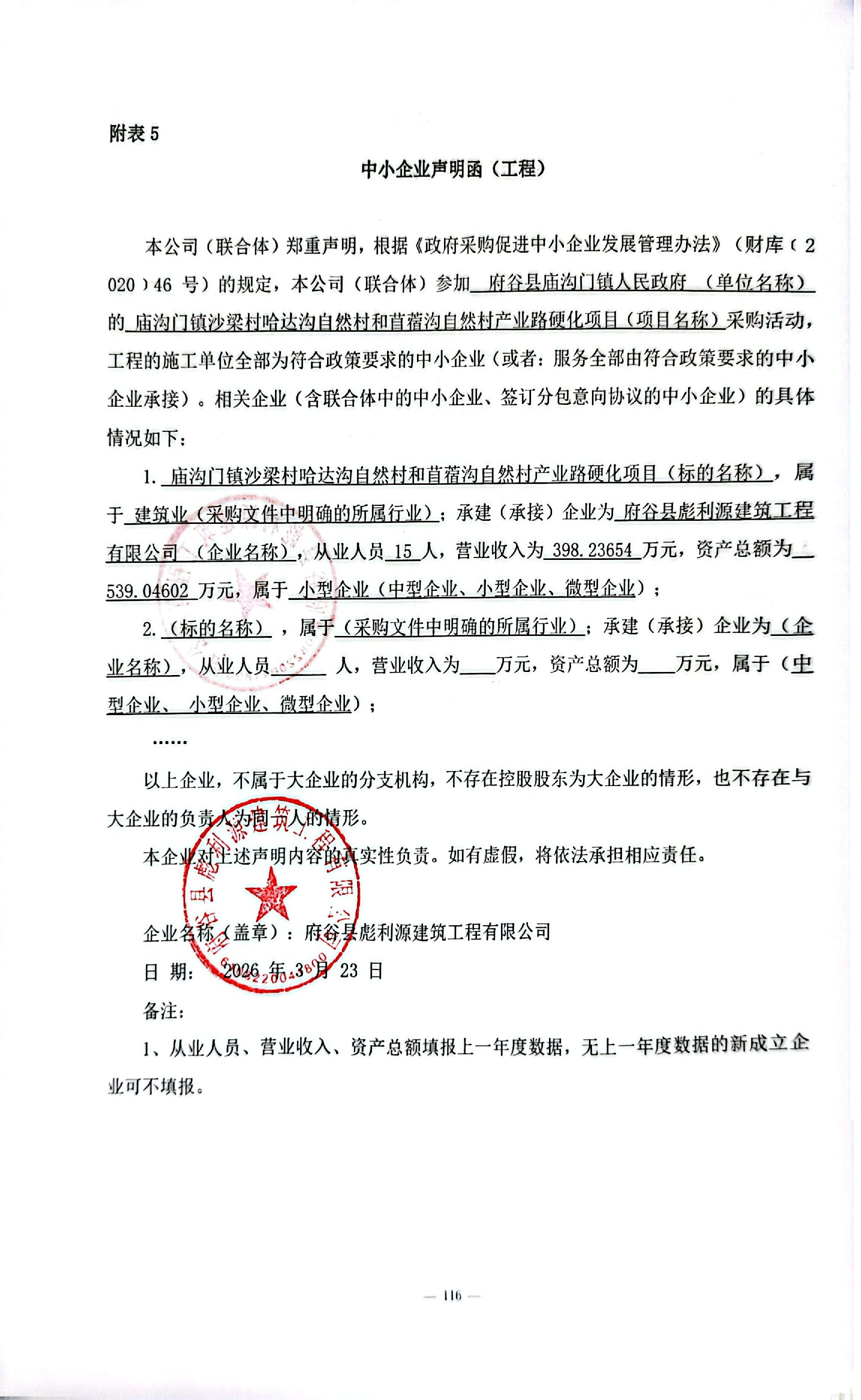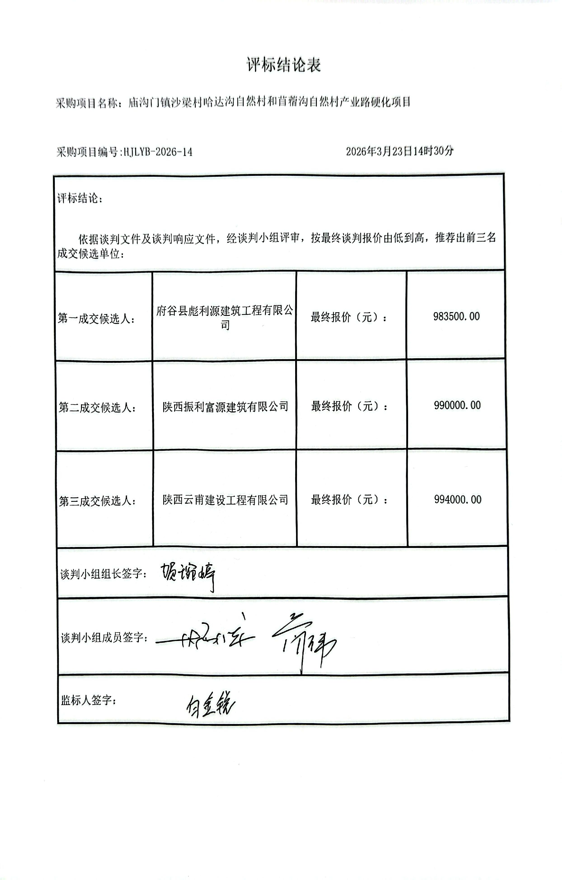庙沟门镇沙梁村哈达沟自然村和苜蓿沟自然村产业路硬化项目中标(成交)结果公告