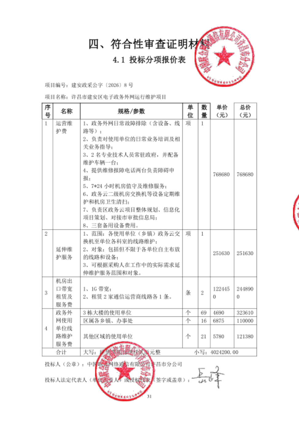 | *、采购项目名称:许昌市建安区电子政务外网运行维护项目 | |||||||||||||||||||||||||||||||