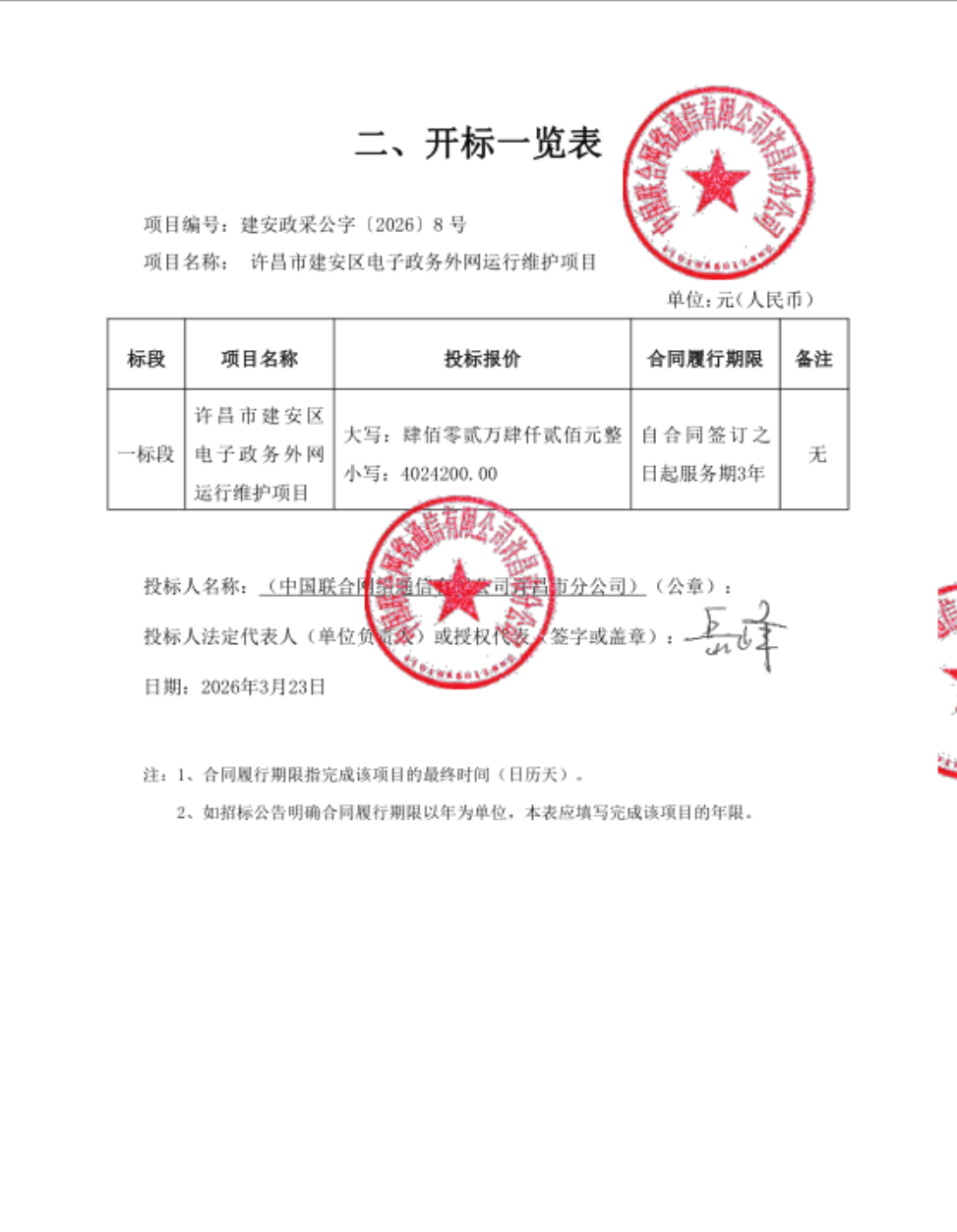 建安政采公字〔2026〕8号许昌市建安区行政审批和政务信息管理局许昌市建安区电子政务外网运行维护项目-中标公告
