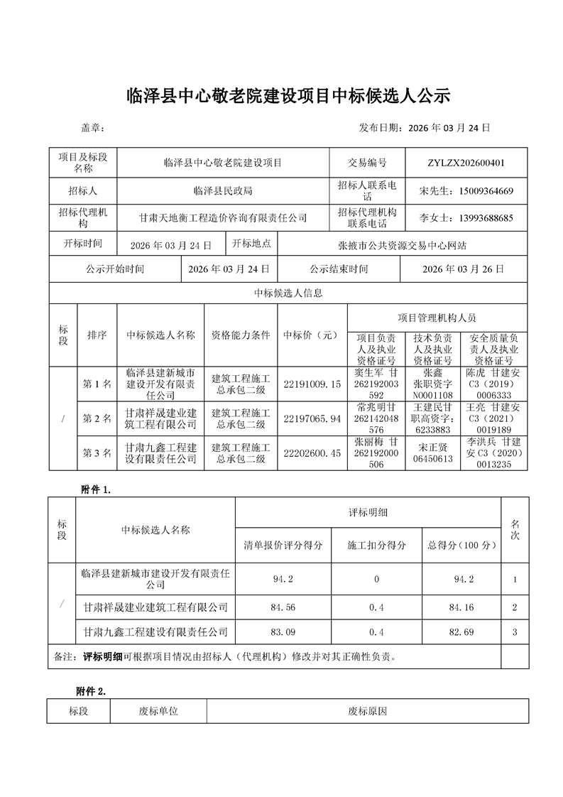 [市本级]临泽县中心敬老院建设项目中标候选人公示[交易结果公示]