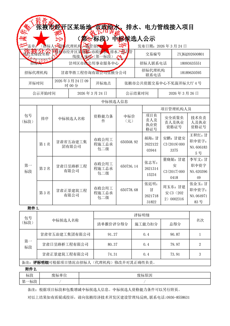 [市本级]张掖市经开区某场地-市政给水、排水、电力管线接入项目(第一标段)中标候选人公示[交易结果公示]