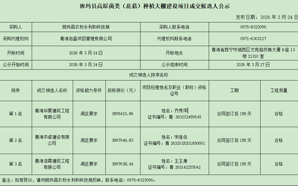 班玛县高原菌类(花菇)种植大棚建设项目中标候选人公示