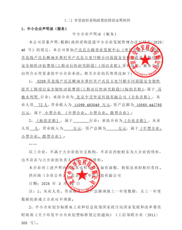 | 本公告公示期为*个工作日。供应商对成交结果有异议的,可以在本成交公告公示期(*个工作日)满后*个工作日内,以书面形式向采购代理机构提出质疑(法定代表人签字并加盖单位公章),由法定代表人或其授权代表携带企业营业执照(加盖公章)及本人身份证件一并提交,并以质疑函接受的确认日期作为受理时间,逾期未提交或未按照要求提交的质疑函将不予受理。其他补充事宜(成交其他内容) 成交供应商:北京中交华安科技有限公司 统一社会信用代码:****************** 资质:工程咨询甲级资信证书(公路工程) 法定代表人:刘洪启 项目负责人:姚伟 联系电话:*********** 质量要求:符合国家及行业相关标准和规范要求,并通过相关部门验收 | |||||||||||||||||||||||||||||||