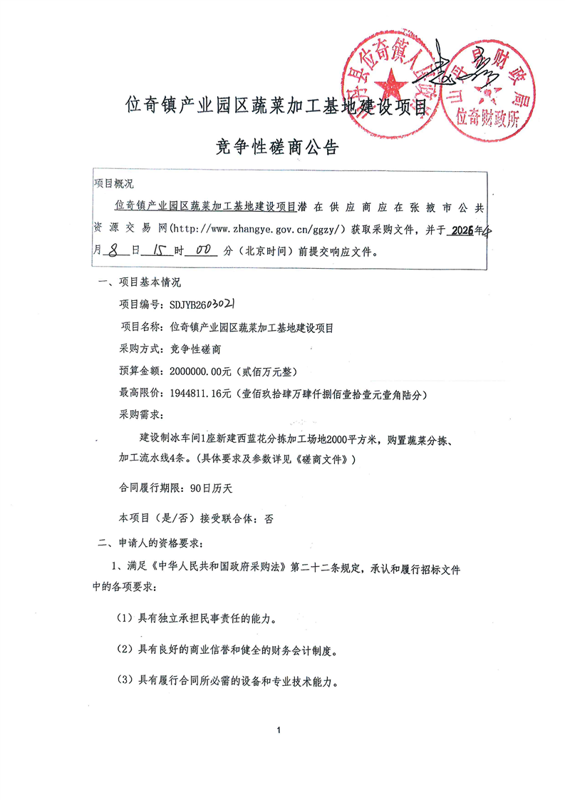 位奇镇产业园区蔬菜加工基地建设项目竞争性磋商公告[采购/资审公告]
