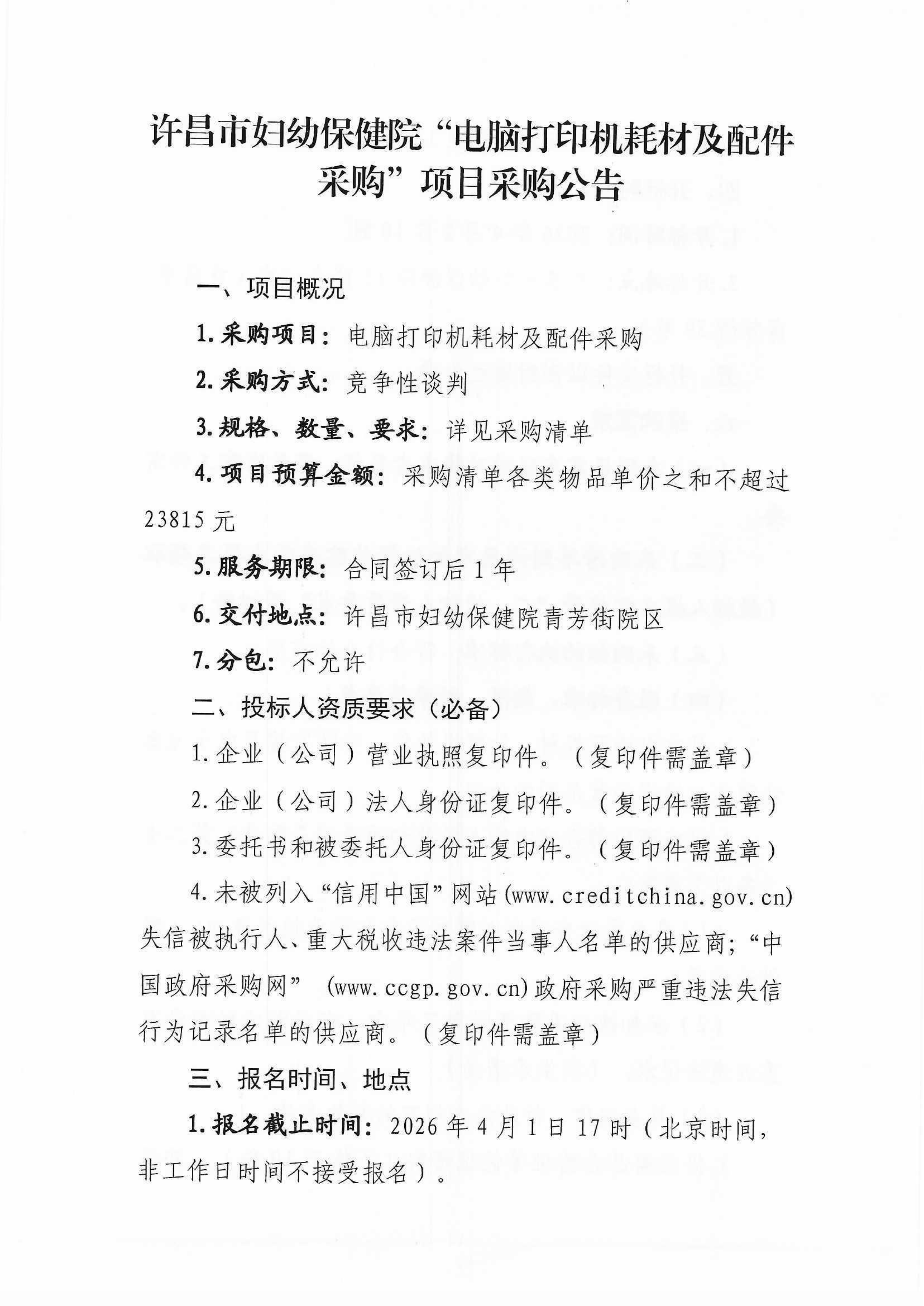 许昌市妇幼保健院“电脑打印机耗材及配件采购”项目采购公告