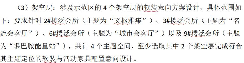 答:仅需在*#、*#、*#、*#楼中至少选取其中*个架空层完成符合其主题定位的软装与活动家具配置意向设计;基础资料附图中已标识出“核心区架空层”和“非核心区架空层”区域示意。