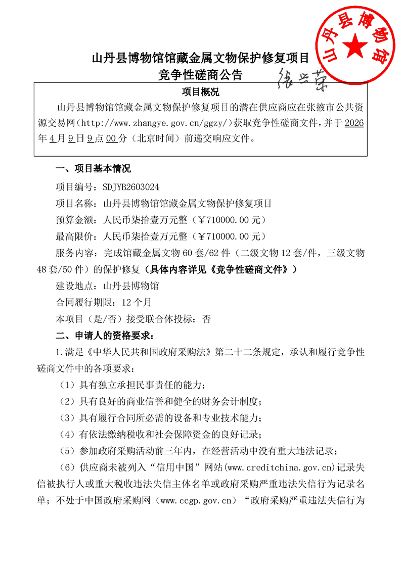 山丹县博物馆馆藏金属文物保护修复项目竞争性磋商公告[采购/资审公告]