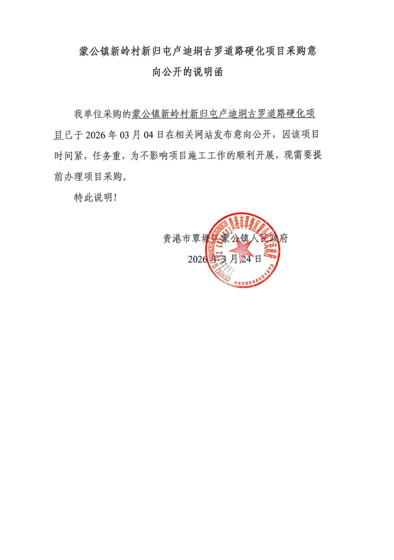 蒙公镇新岭村新归屯卢迪垌古罗道路硬化项目项目的潜在供应商应在广西政府采购云平台线上获取获取采购文件,并于****年**月**日 **:**(北京时间)前提交响应文件。