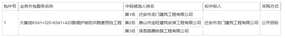 大秦线K541+320-K541+420路堤护坡防洪隐患预抢工程中标候选人公示
