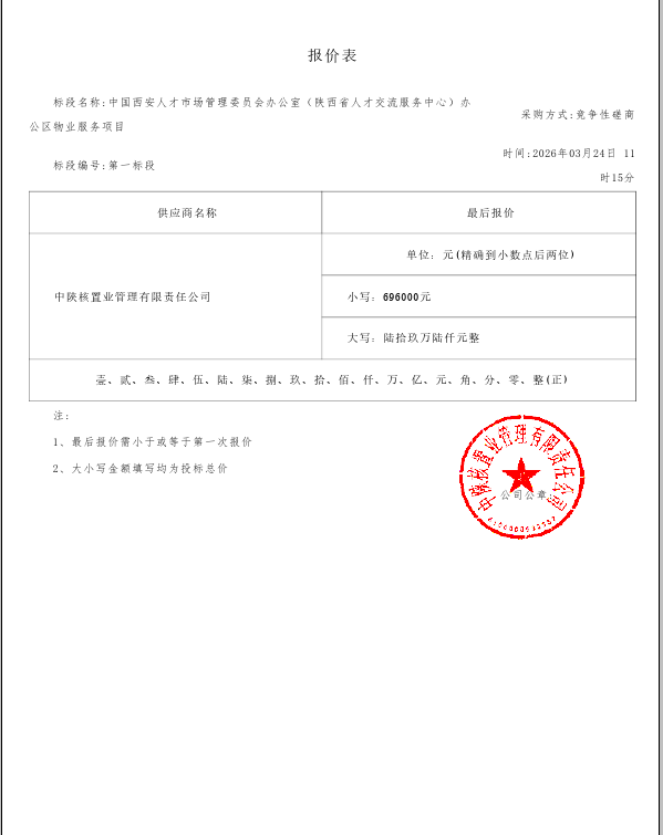 中国西安人才市场管理委员会办公室(陕西省人才交流服务中心)办公区物业服务项目中标(成交)结果公告