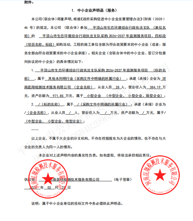 [平顶山市]【平公资采2026186】平顶山市生态环境综合行政执法支队采购2026-2027年监测服务项目(第四标段)-中标公告