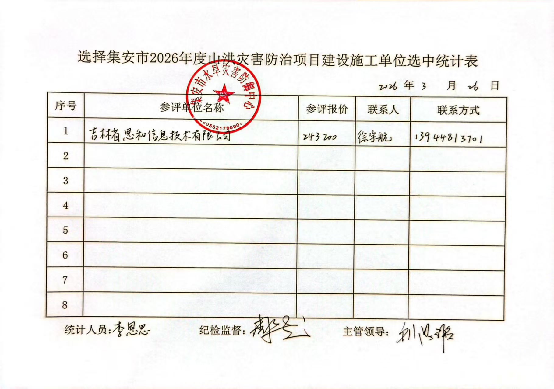 我单位于****年*月**日在集安市人民政府网站对外发布了询价公告。至****年*月**日**时止,共有*家建设施工单位参与评选。各家报价分别为:吉林省中科源水信息技术有限公司报价******元、吉林省沃客信息技术有限公司报价******元、吉林省恩和信息技术有限公司报价******元,因吉林省恩和信息技术有限公司为最低,被评选为本次项目的建设施工单位。