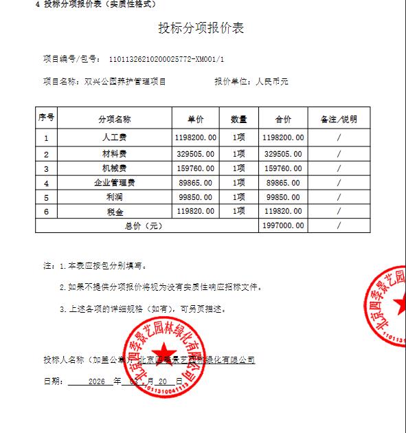 | 北京四季景艺园林绿化有限公司 | * | ***.*万元 | ***.*万元 | 详见招标文件 |