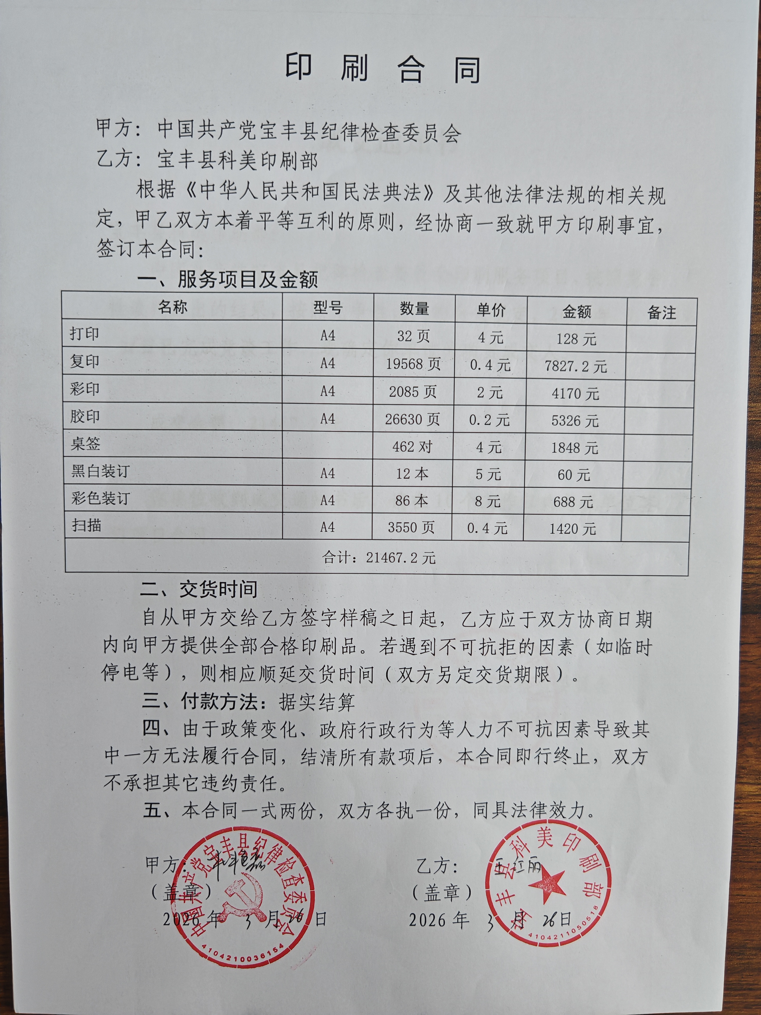 | 二、合同名称:宝丰县纪委印刷服务费 | ||||||||||||