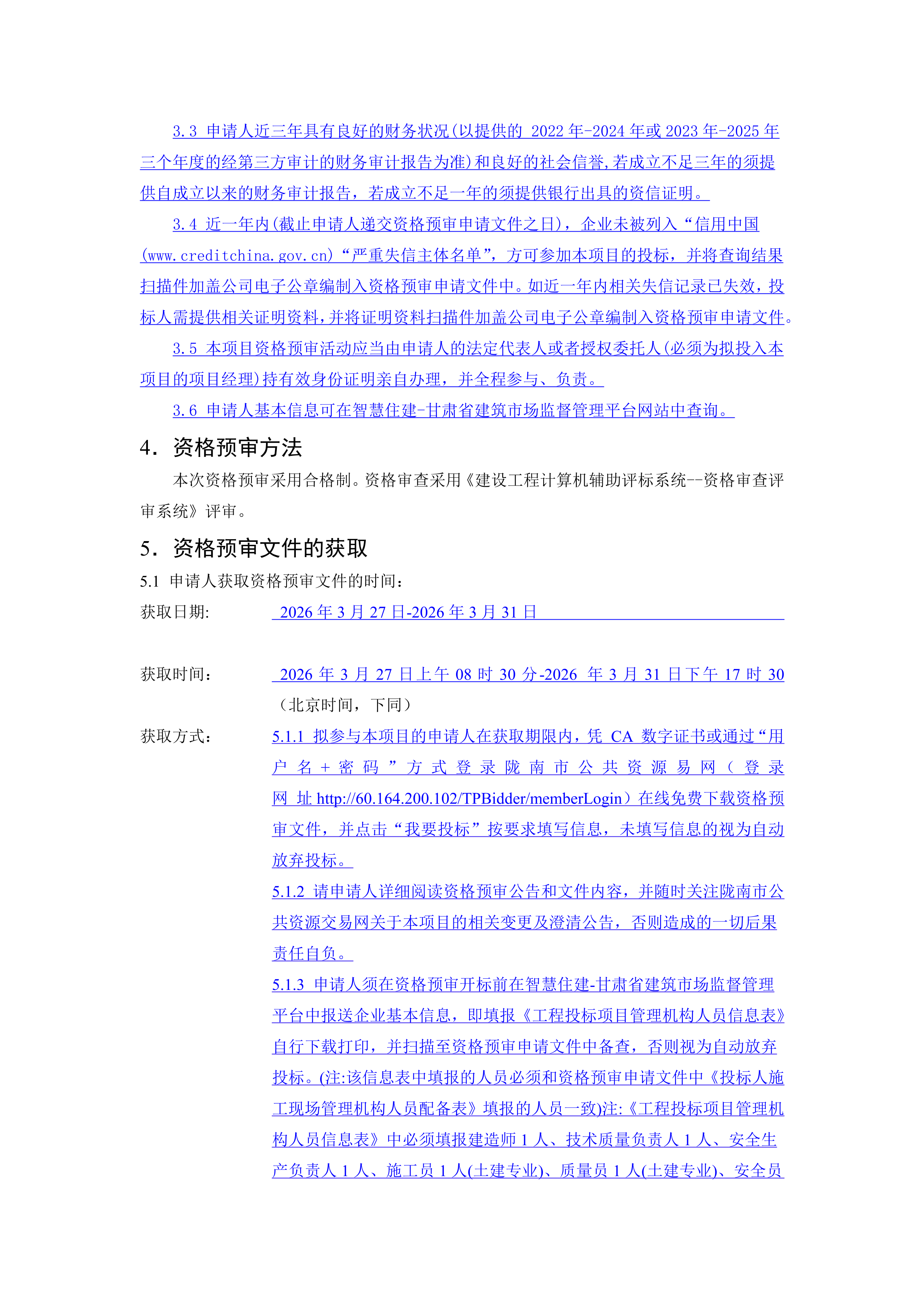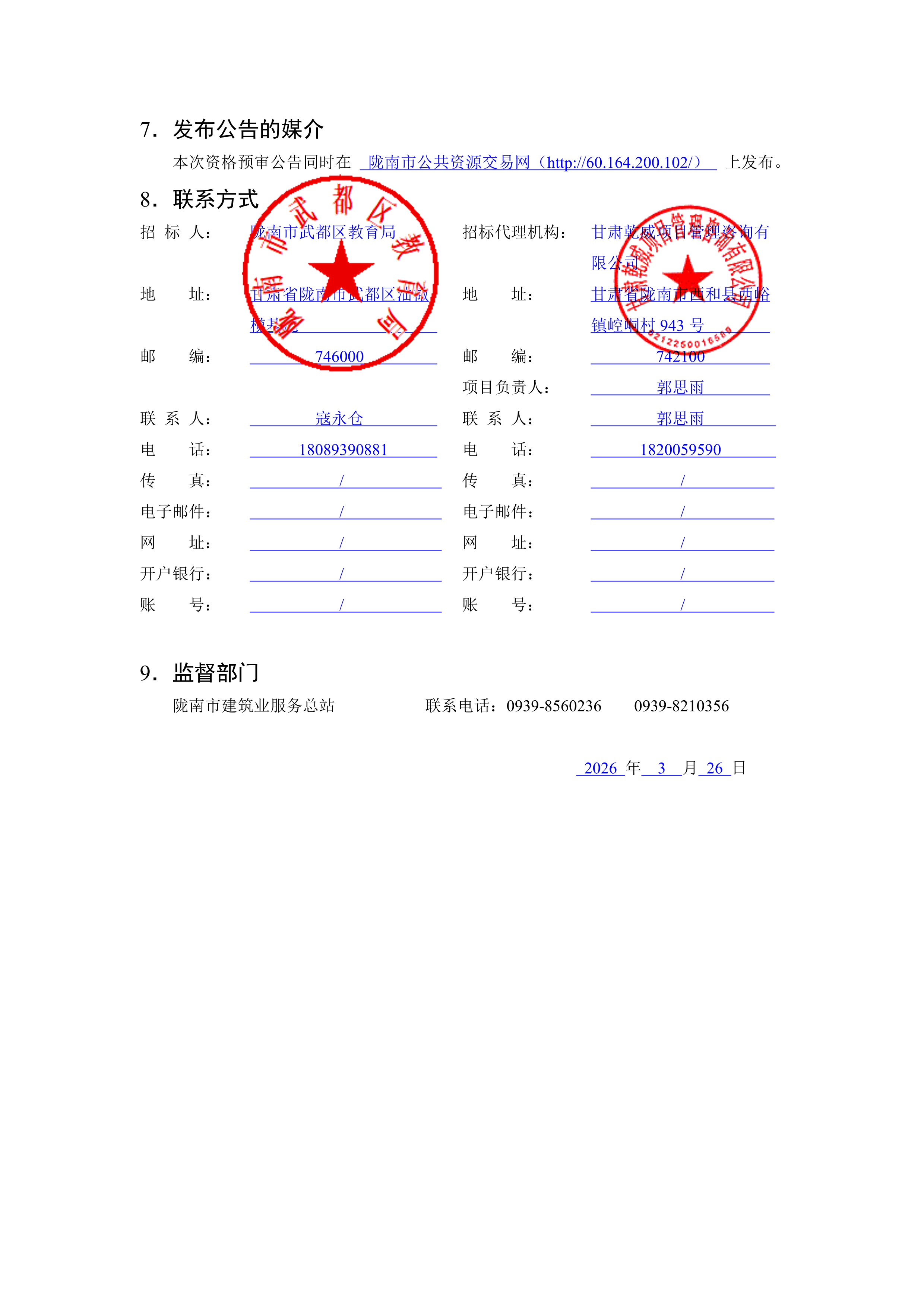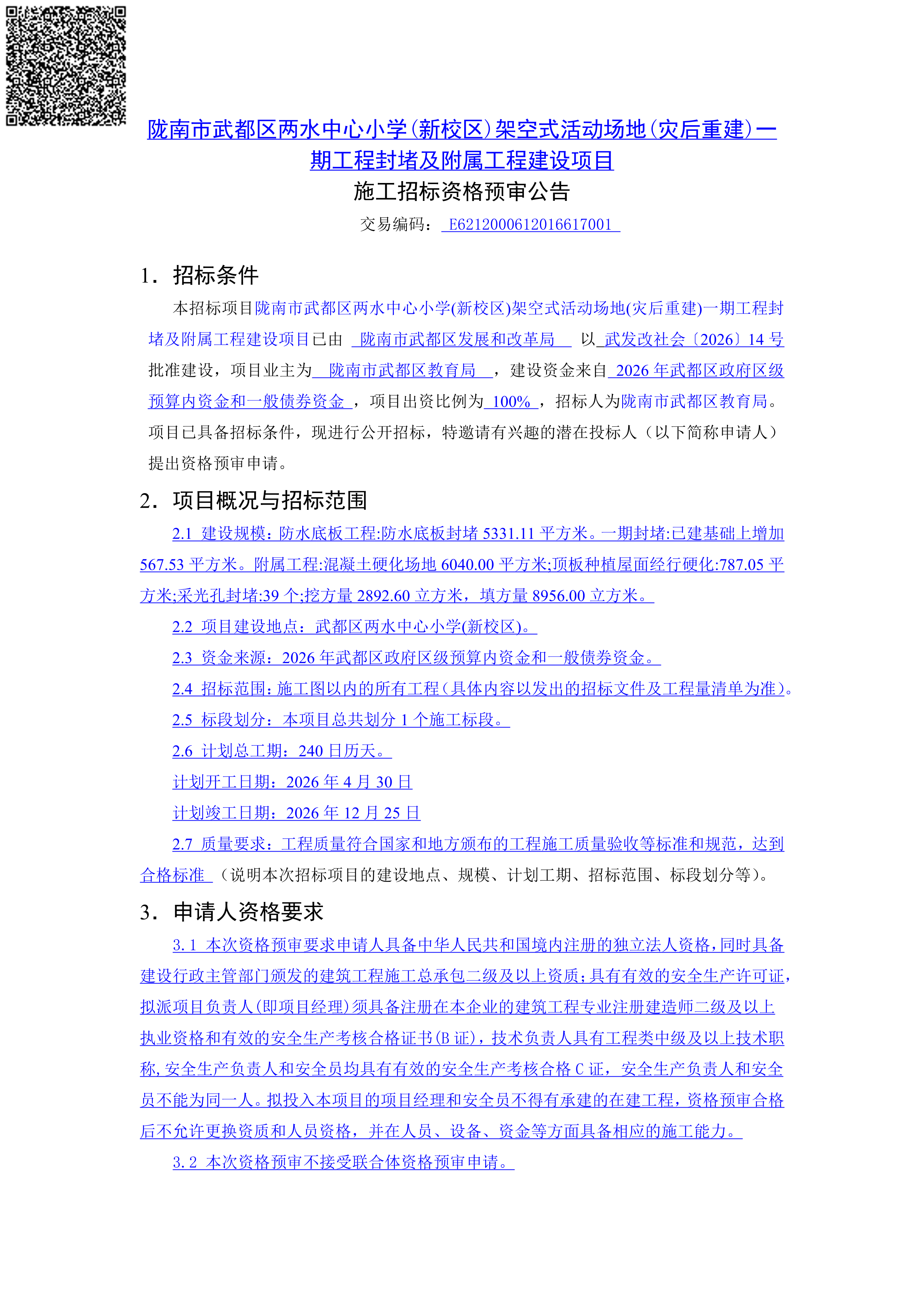 陇南市武都区两水中心小学(新校区)架空式活动场地(灾后重建)一期工程封堵及附属工程建设项目施工招标资格预审公告[招标/资审公告]
