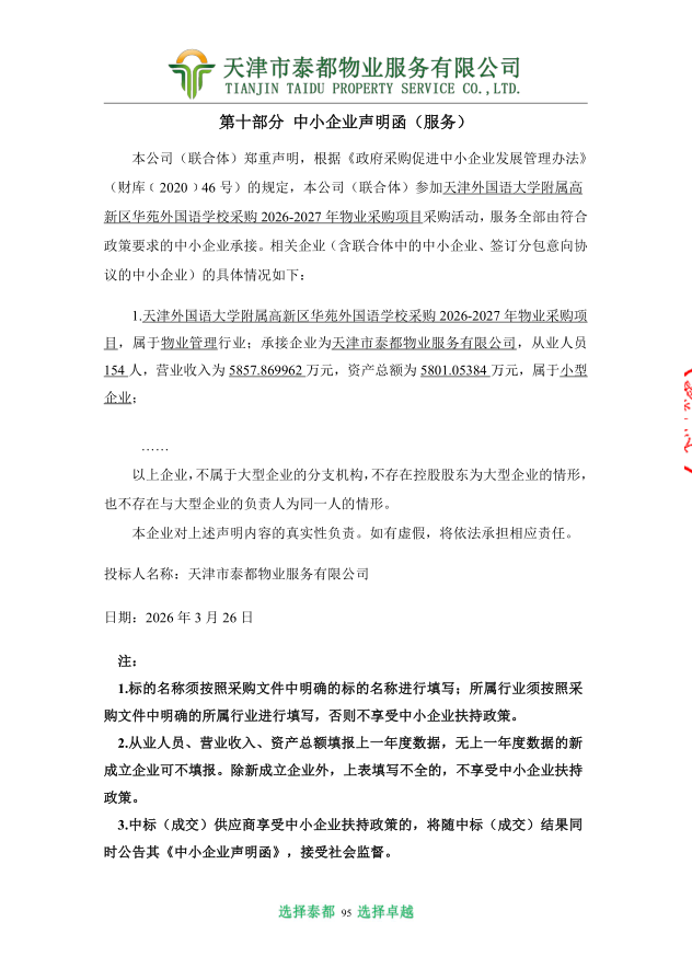受天津外国语大学附属高新区华苑外国语学校委托,天津市滨海新区政府采购中心以公开招标方式,对天津外国语大学附属高新区华苑外国语学校采购*********年物业采购项目实施采购,现将中标结果公布如下: 一、项目名称和编号 *.项目名称:天津外国语大学附属高新区华苑外国语学校采购*********年物业采购项目 *.项目编号:**************** 二、中标信息 *.中标供应商名称:天津市泰都物业服务有限公司 *.中标供应商地址:津南区赤龙街联东优谷产业园******** *.供应商评审报价、评审总得分及排序情况:见附件 *.主要中标标的名称、规格型号、数量、单价、服务要求或者标的基本概况:物业管理服务 三、评标委员会成员名单 董海亮、乐岩、戈献环、张健文、潘启贤(采购人代表) 四、项目联系人及联系方式 *.联系人:肖琳 *.联系方式:************ 五、采购人的名称、地址和联系方式 *.采购人名称:天津外国语大学附属高新区华苑外国语学校 *.采购人地址:天津滨海高新区华苑科技园,东至规划道路,南至地界,西至地界,北至海泰发展一道 *.采购人联系电话:庞静,************ 六、采购代理机构的名称、地址和联系方式 *.采购代理机构名称:天津市滨海新区政府采购中心 *.采购代理机构地址:天津市滨海新区营口道***号 *.采购代理机构联系方式:************ 七、质疑方式 参与本项目政府采购活动的供应商认为中标结果使自己的合法权益受到损害的,可以在中标结果公告期限届满之日起*个工作日内,以书面形式向采购人和天津市滨海新区政府采购中心提出质疑,逾期不予受理。 八、本项目不向中标供应商收取服务费。 九、中标结果公告期限 中标结果的公告期限为*个工作日。 十、招标文件公告:见附件