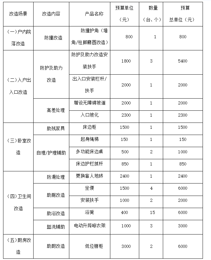 入户通道改造(坡道、平整、防滑)卫生间改造(扶手、坐便、浴凳、防滑处理)厨房低位设施改造、卧室无障碍改造