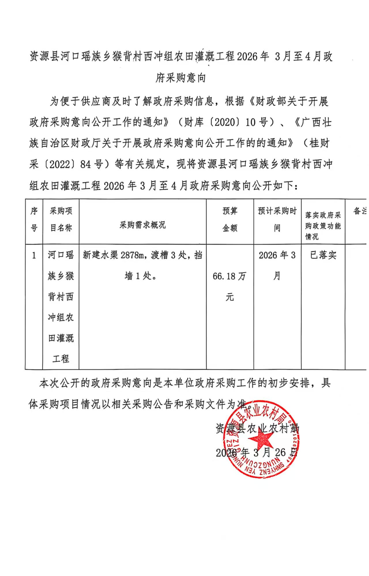 资源县农业农村局2026年3月至4月政府采购意向