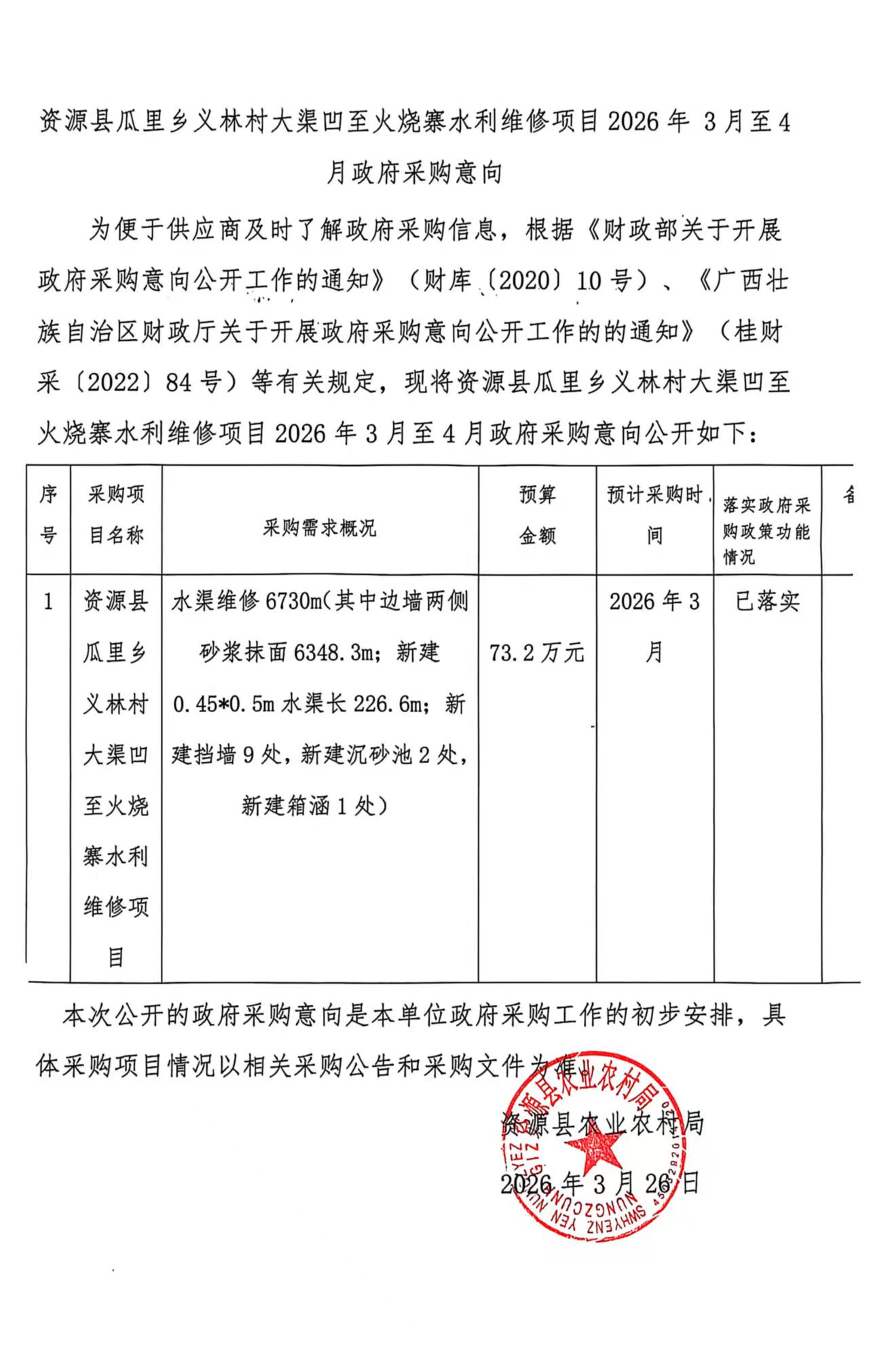 为便于供应商及时了解政府采购信息,根据《财政部关于开展政府采购意向公开工作的通知》(财库〔****〕**号)和《广西壮族自治区财政厅关于进一步规范政府采购意向公开工作的通知》(桂财采〔****〕**号)等有关规定,现将资源县农业农村局****年*月至*月采购意向公开如下: