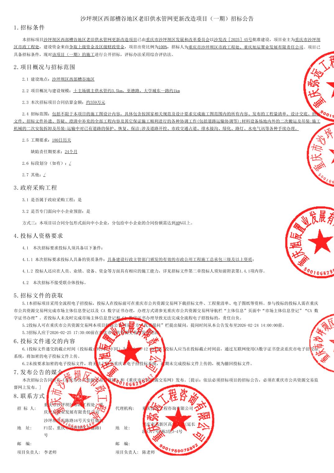 | 名称: | 沙坪坝区西部槽谷地区老旧供水管网更新改造项目(一期)招标公告 | ||||