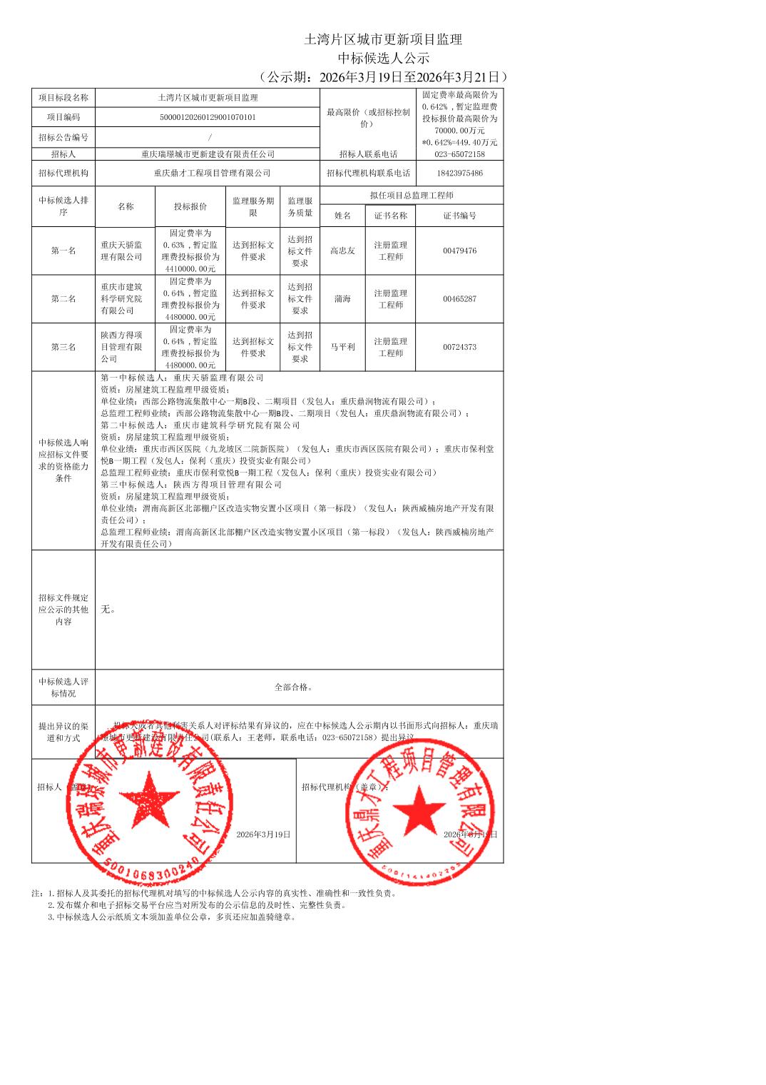 | 名称: | 土湾片区城市更新项目监理中标候选人公示 | ||||