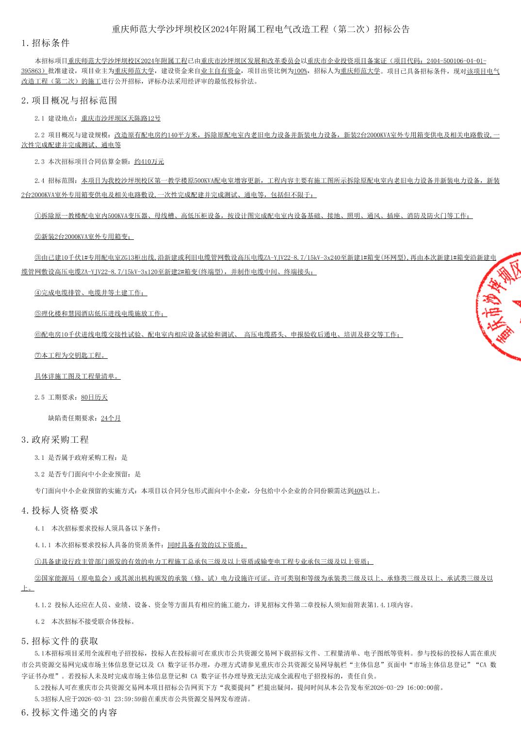 重庆师范大学沙坪坝校区2024年附属工程电气改造工程(第二次)招标公告