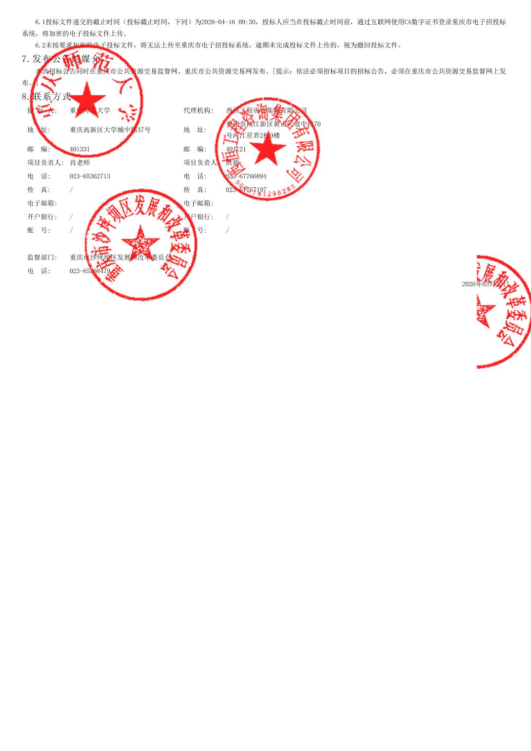 | 名称: | 重庆师范大学沙坪坝校区****年附属工程电气改造工程(第二次)招标公告 | ||||
