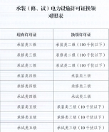 按照《承装(修、试)电力设施许可证管理办法》(****年第**号令),自****年*月*日许可证证书等级及承揽范围发生变更,依据《国家能源局关于做好承装(修、试)电力设施许可证换领和延续工作的通知》(国能发资质〔****〕**号),等级对照表如下。
