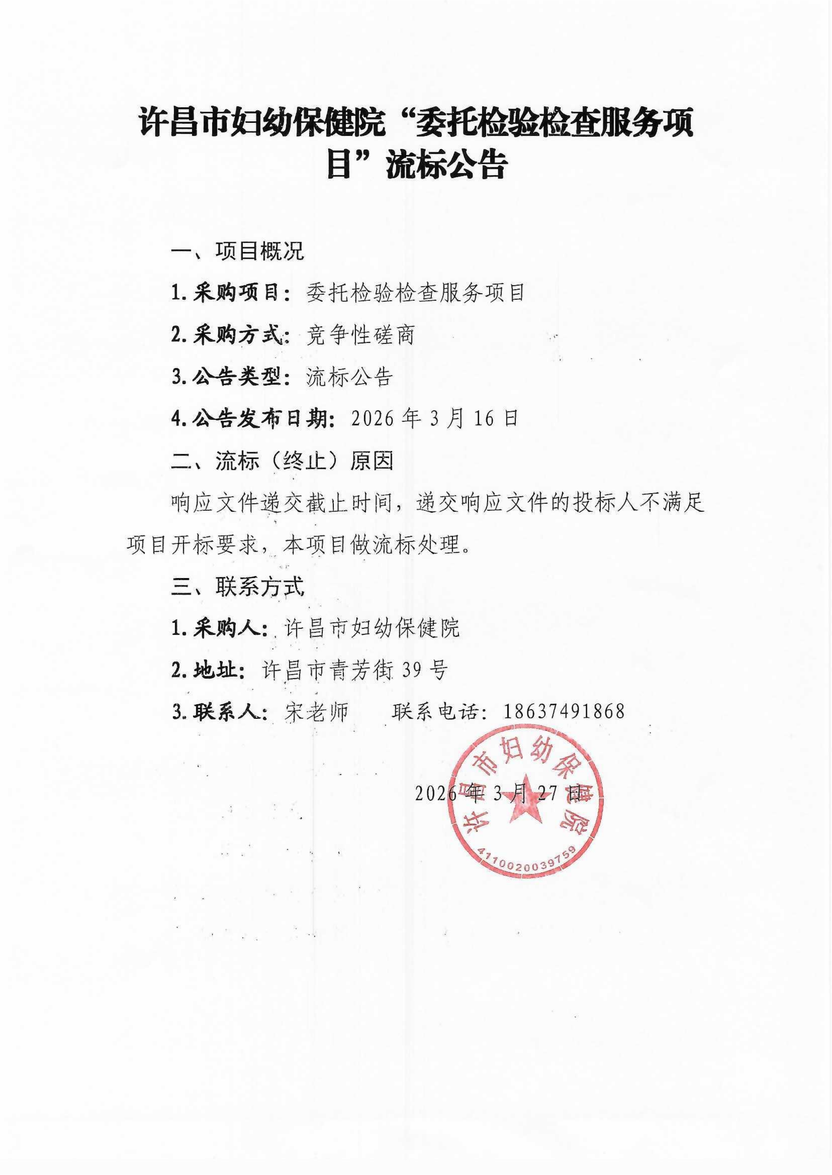 许昌市妇幼保健院“委托检验检查服务项目”项目流标公告