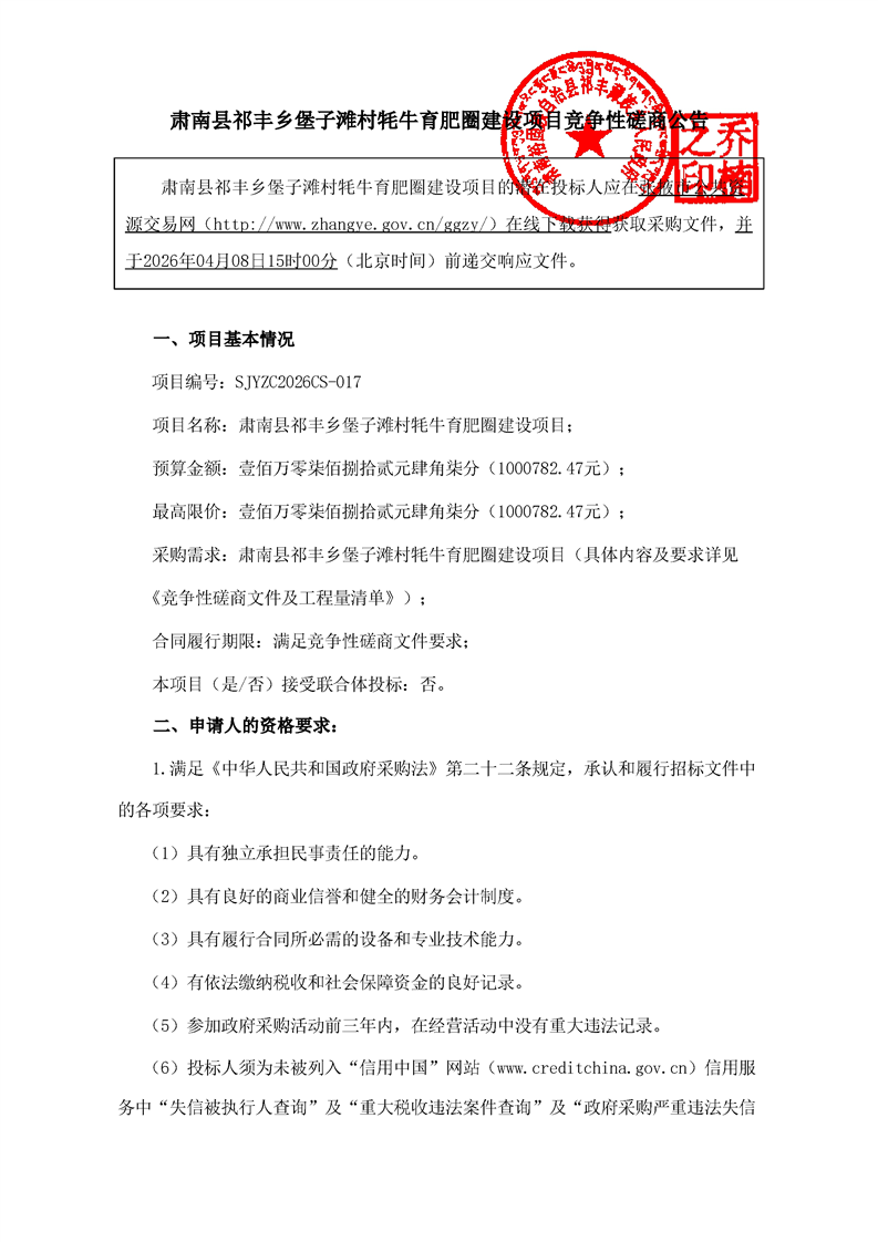 肃南县祁丰乡堡子滩村牦牛育肥圈建设项目竞争性磋商公告[采购/资审公告]