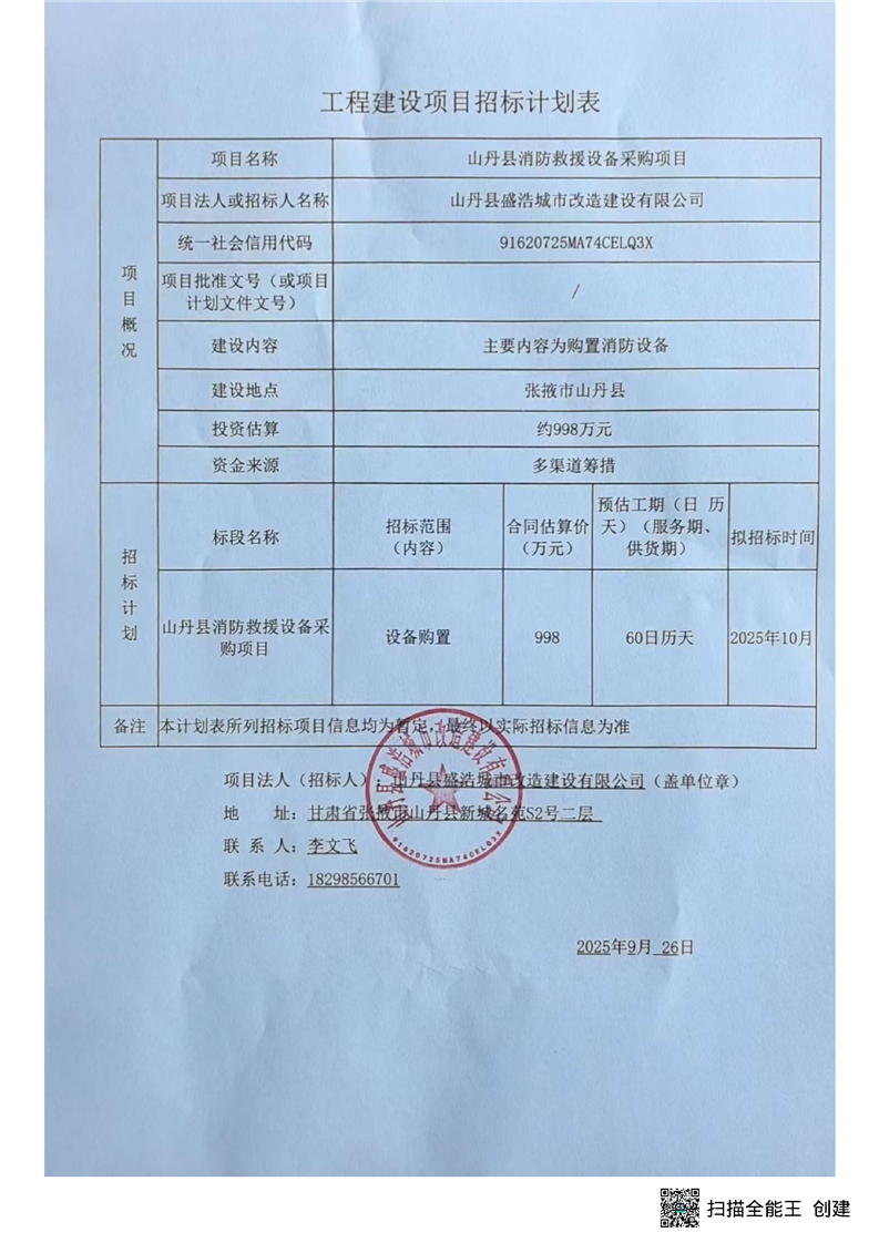 山丹县消防救援设备采购项目招标计划