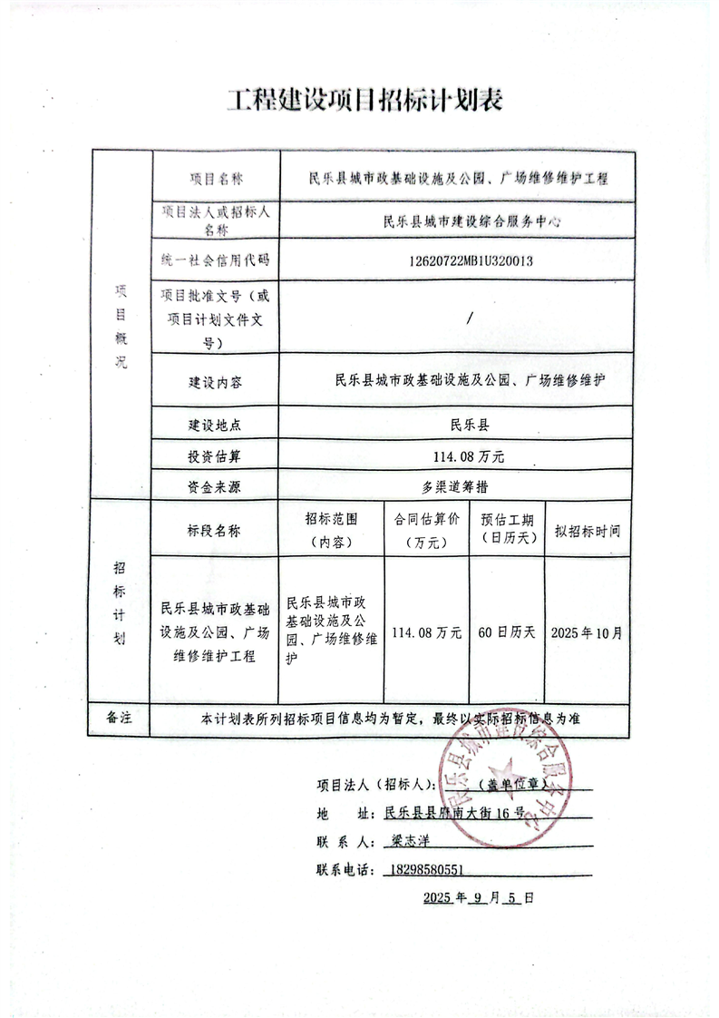 民乐县城市政基础设施及公园、广场维修维护工程招标计划