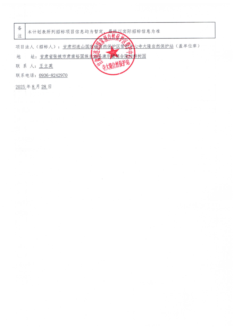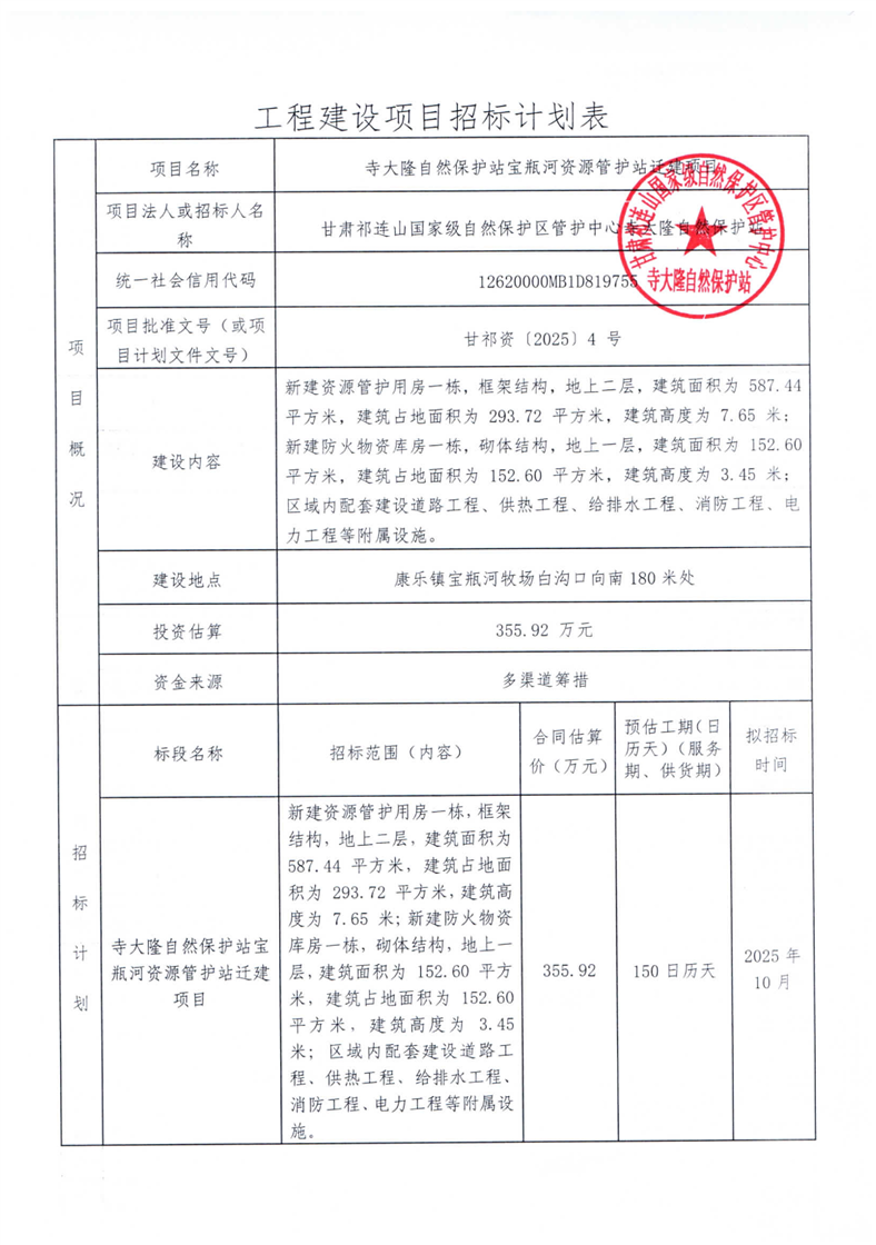 寺大隆自然保护站宝瓶河资源管护站迁建项目招标计划
