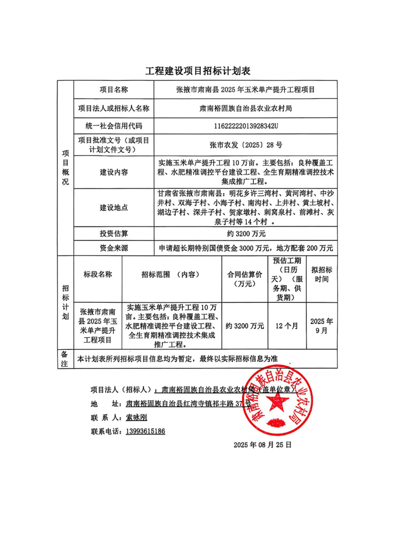 张掖市肃南县2025年玉米单产提升工程项目招标计划