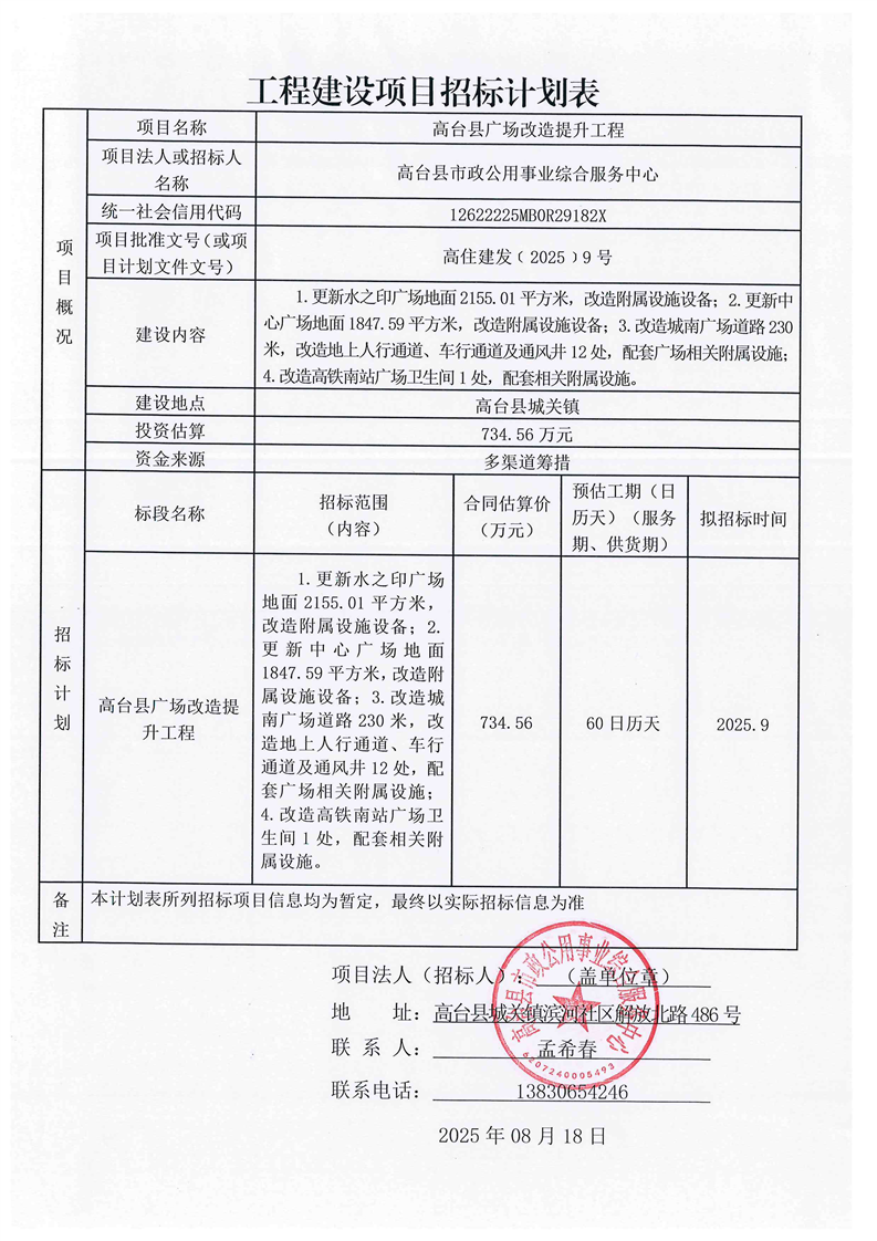 高台县广场改造提升工程招标计划