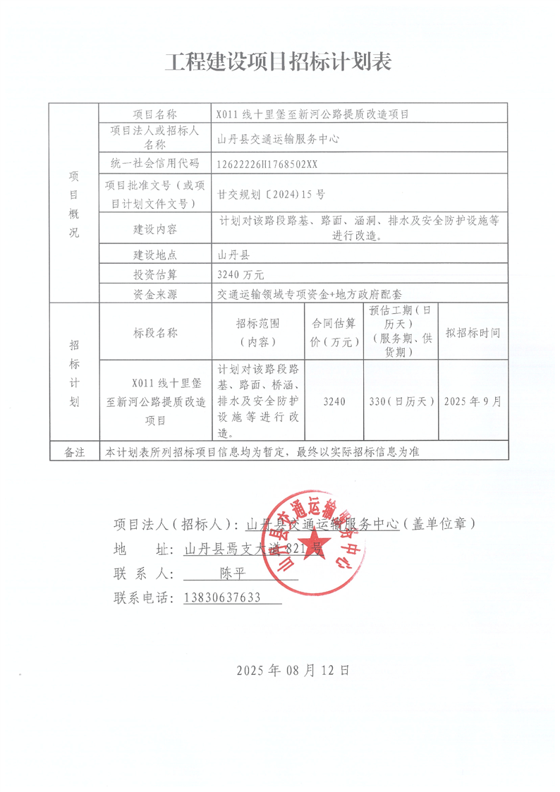 X011线十里堡至新河公路提质改造项目招标计划