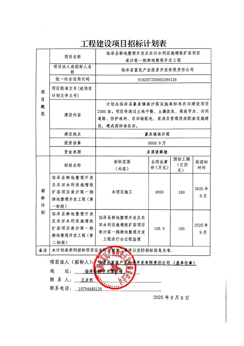 临泽县耕地整理开发及农田水利设施增效扩容项目南沙窝一期耕地整理开发工程招标计划