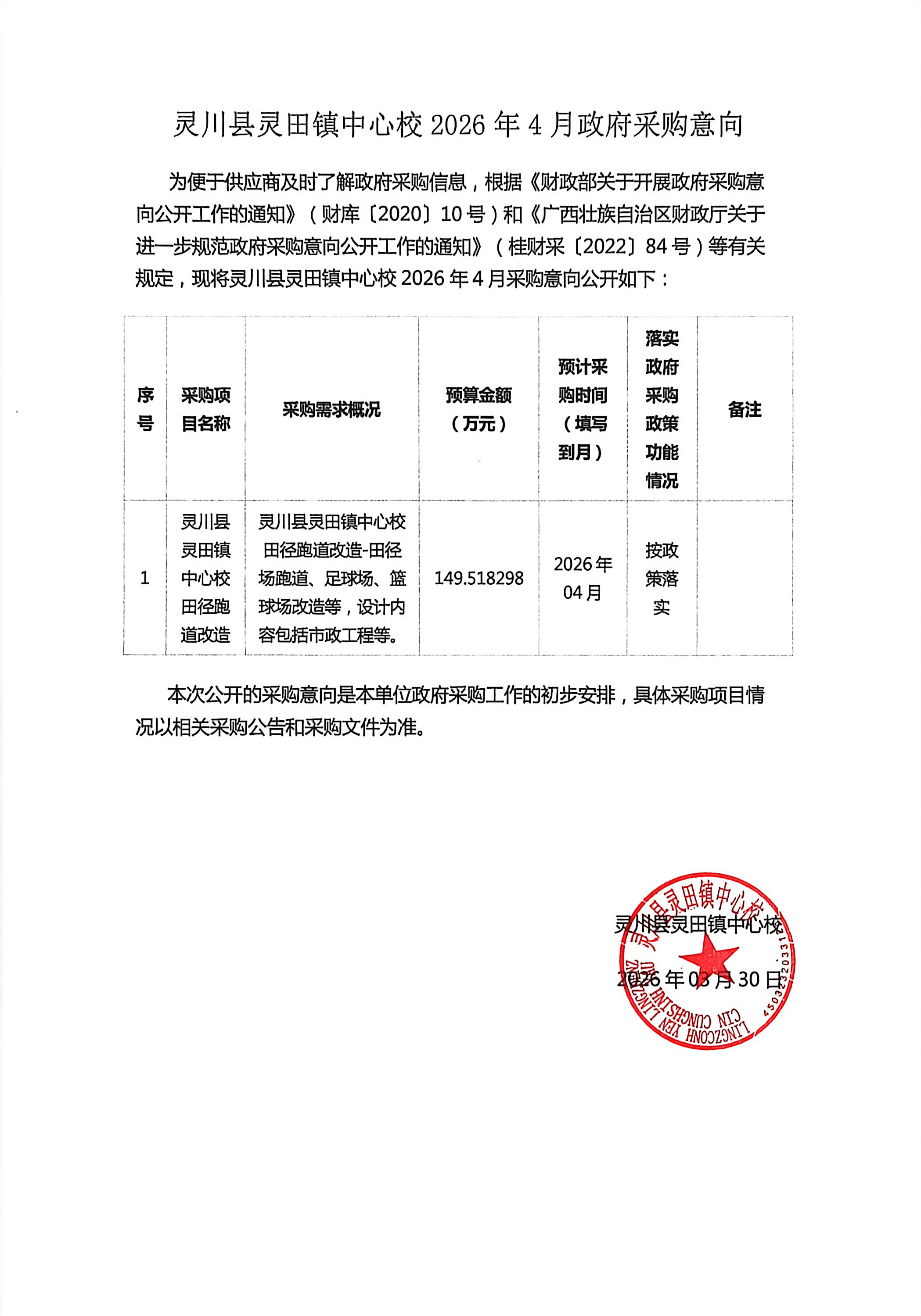 灵川县灵田镇中心校2026年4月至5月政府采购意向