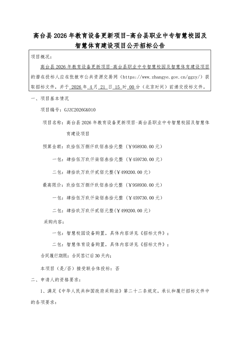 高台县2026年教育设备更新项目-高台县职业中专智慧校园及智慧体育建设项目公开招标公告[采购/资审公告]