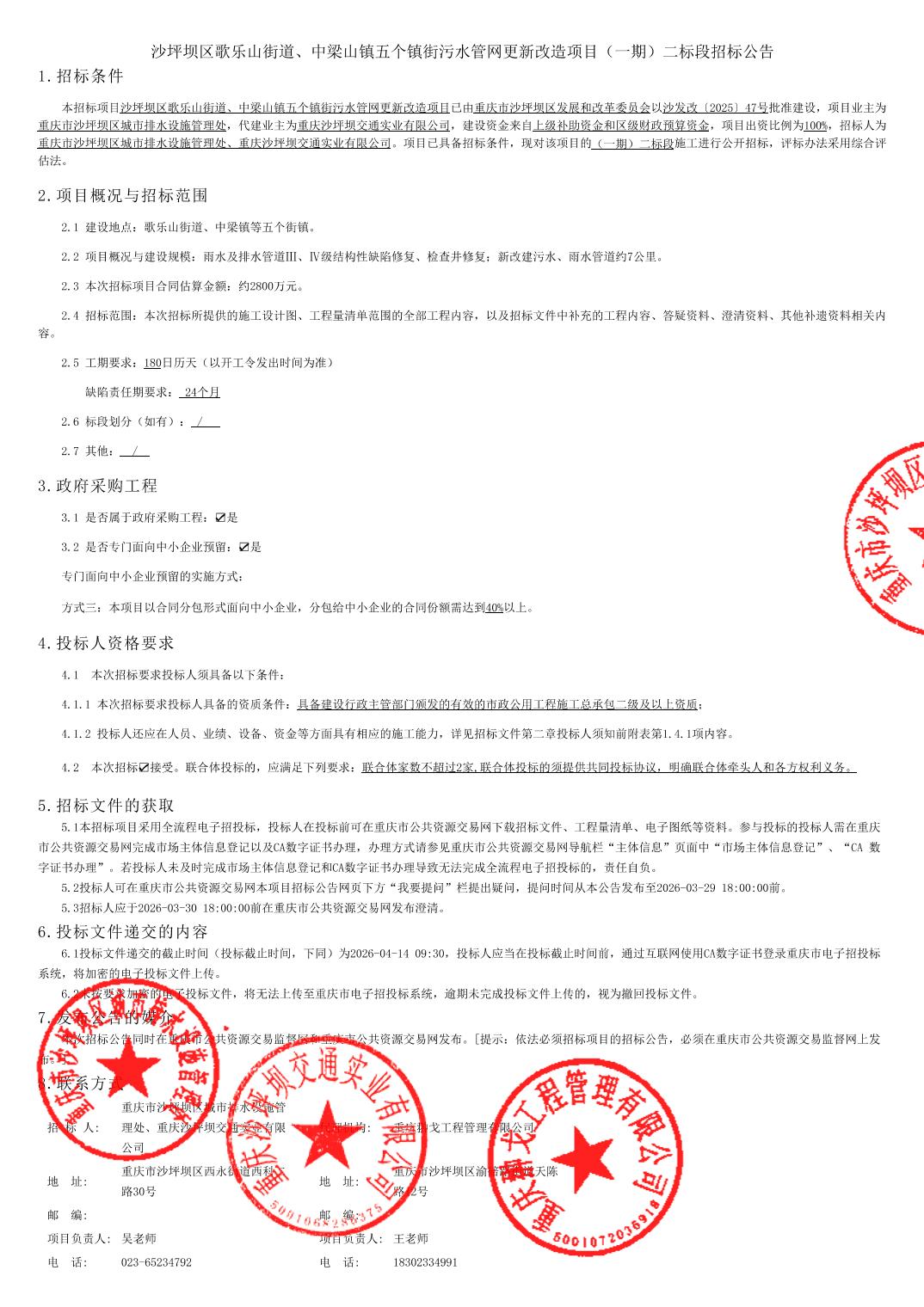 沙坪坝区歌乐山街道、中梁山镇五个镇街污水管网更新改造项目(一期)二标段招标公告
