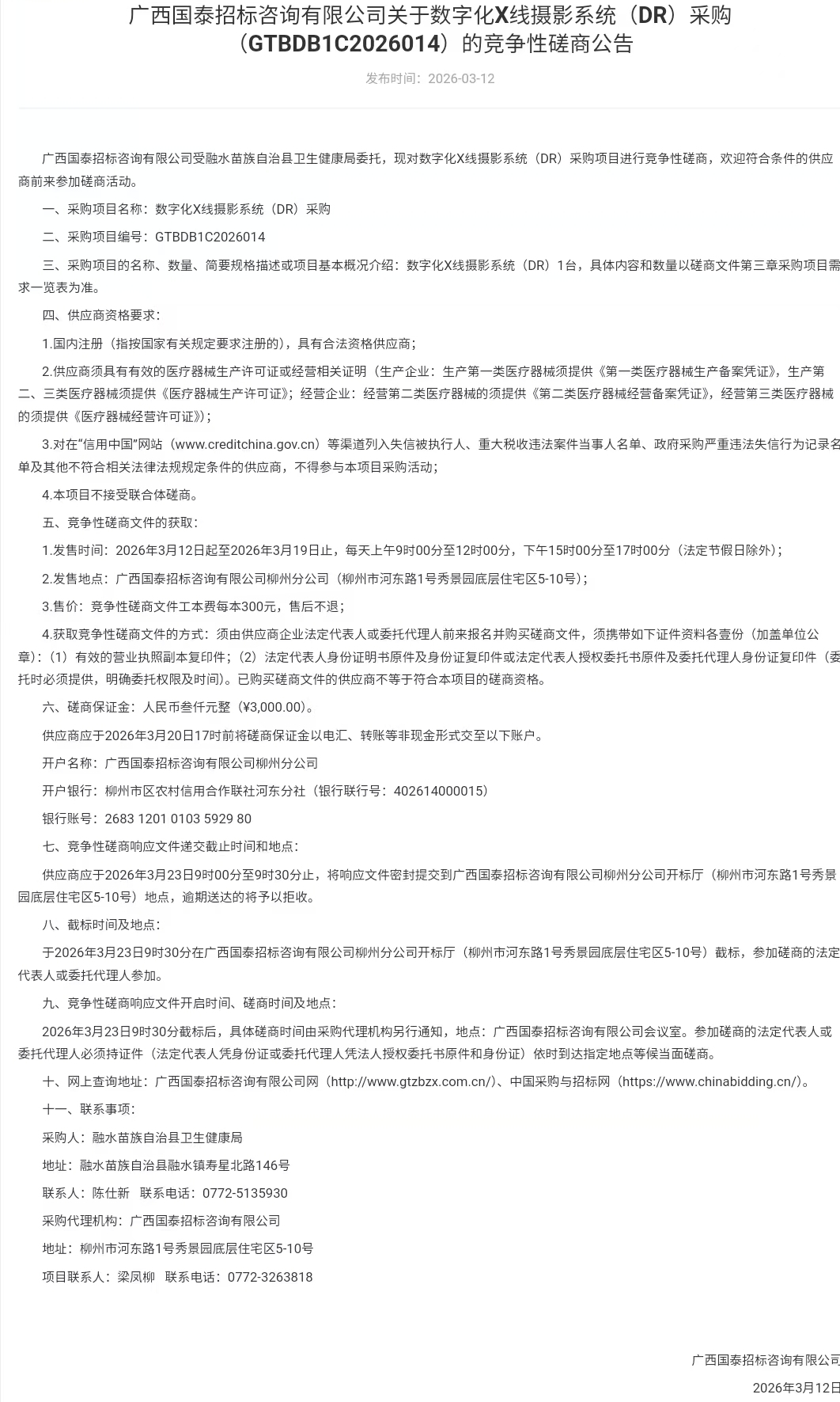 广西国泰招标有限公司关于数字化X线摄影系统(DR)采购(GTBDB1C2026014)的竞争性磋商公告