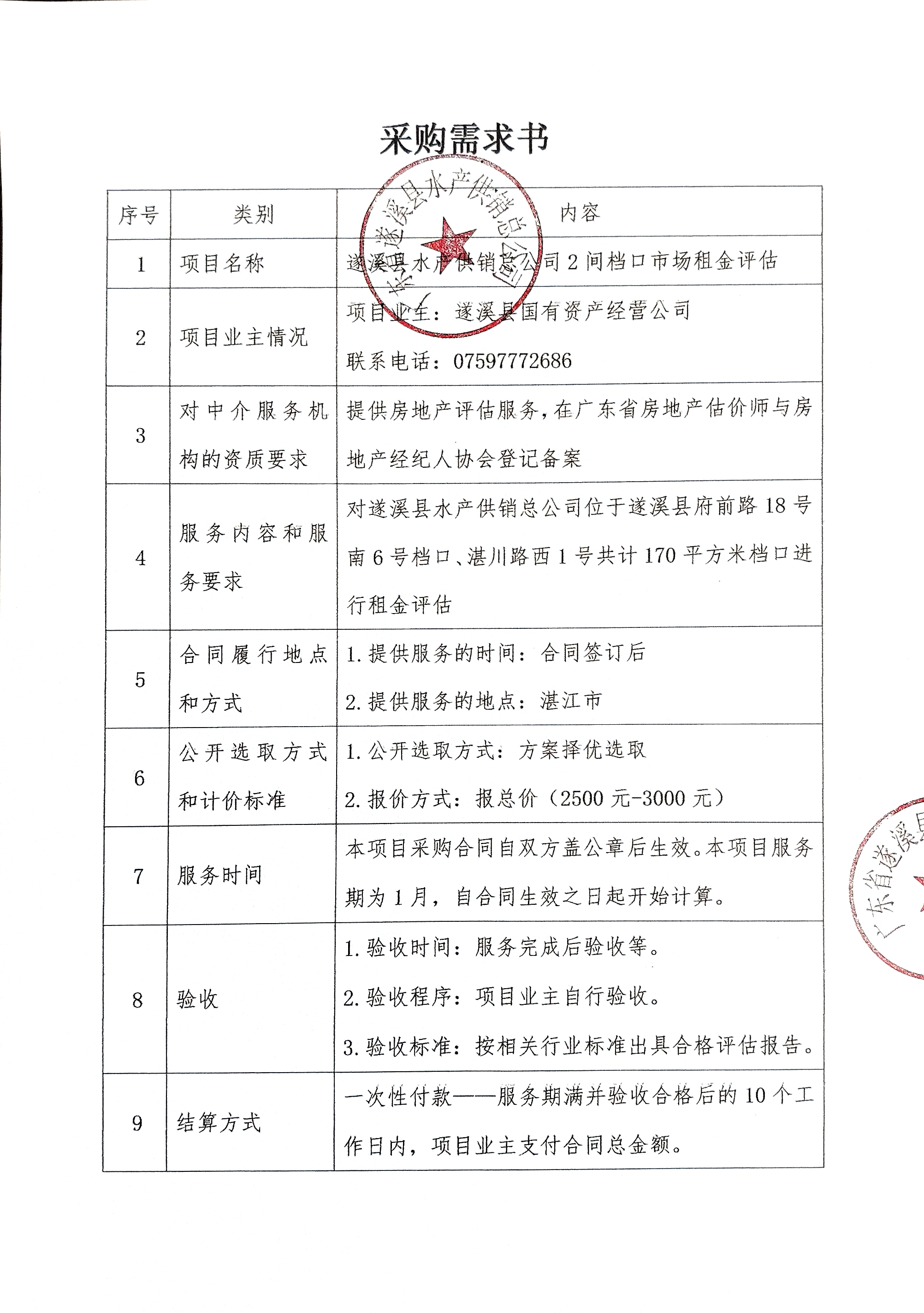 遂溪县水产供销总公司2间档口市场租金评估采购公告