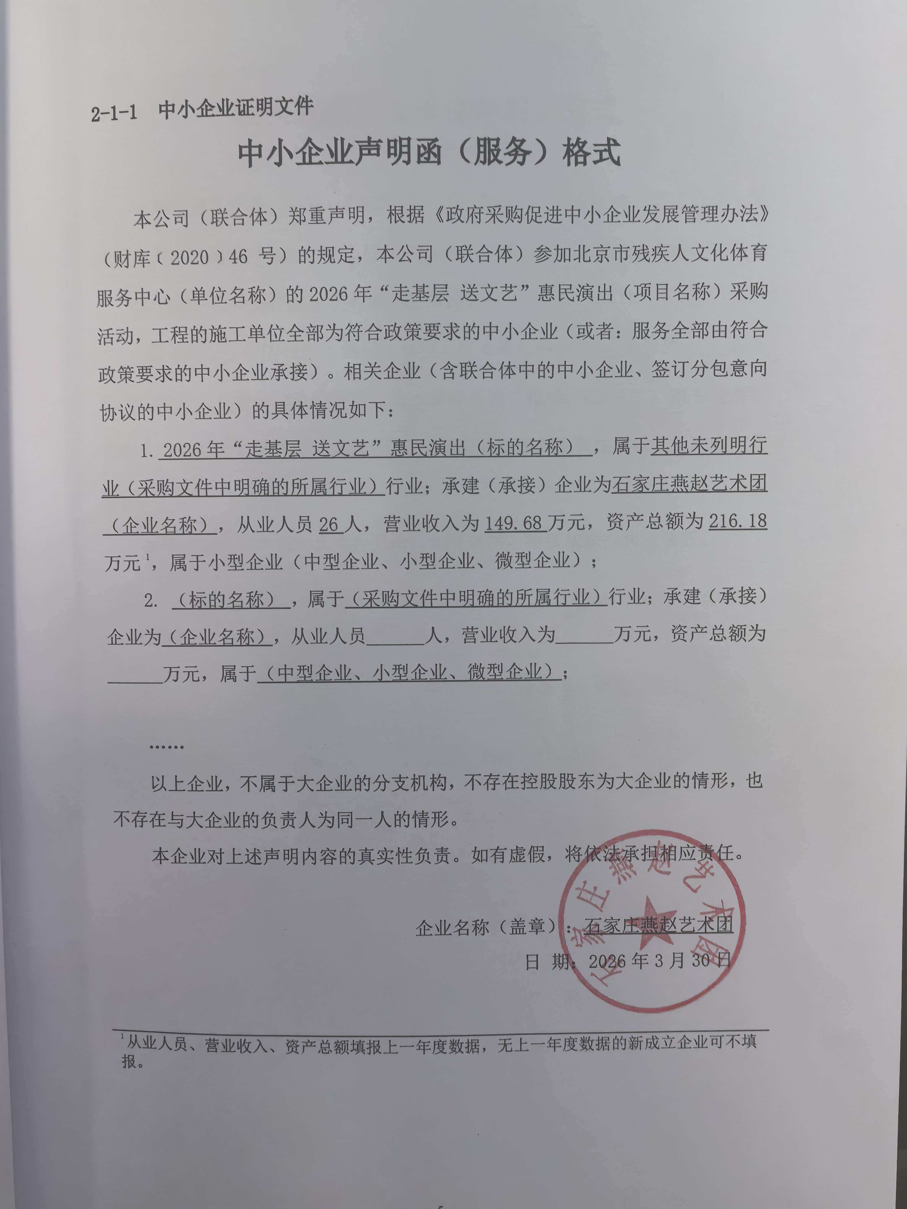 | 石家庄燕赵艺术团 | * | **.**万元 | **.**万元 | 演出团体要紧密结合深入贯彻党的二十大及历次全会精神要求,立足****年庆祝中国共产党成立***周年重要节点,围绕 “十五五” 残疾人事业发展规划开局部署,组织好****年“走基层 送文艺”惠民演出活动,宣传好首都残疾人事业高质量发展的新成效、新突破,展现残疾人自强不息、奋勇拼搏的精神风貌,具体详见采购需求。 |