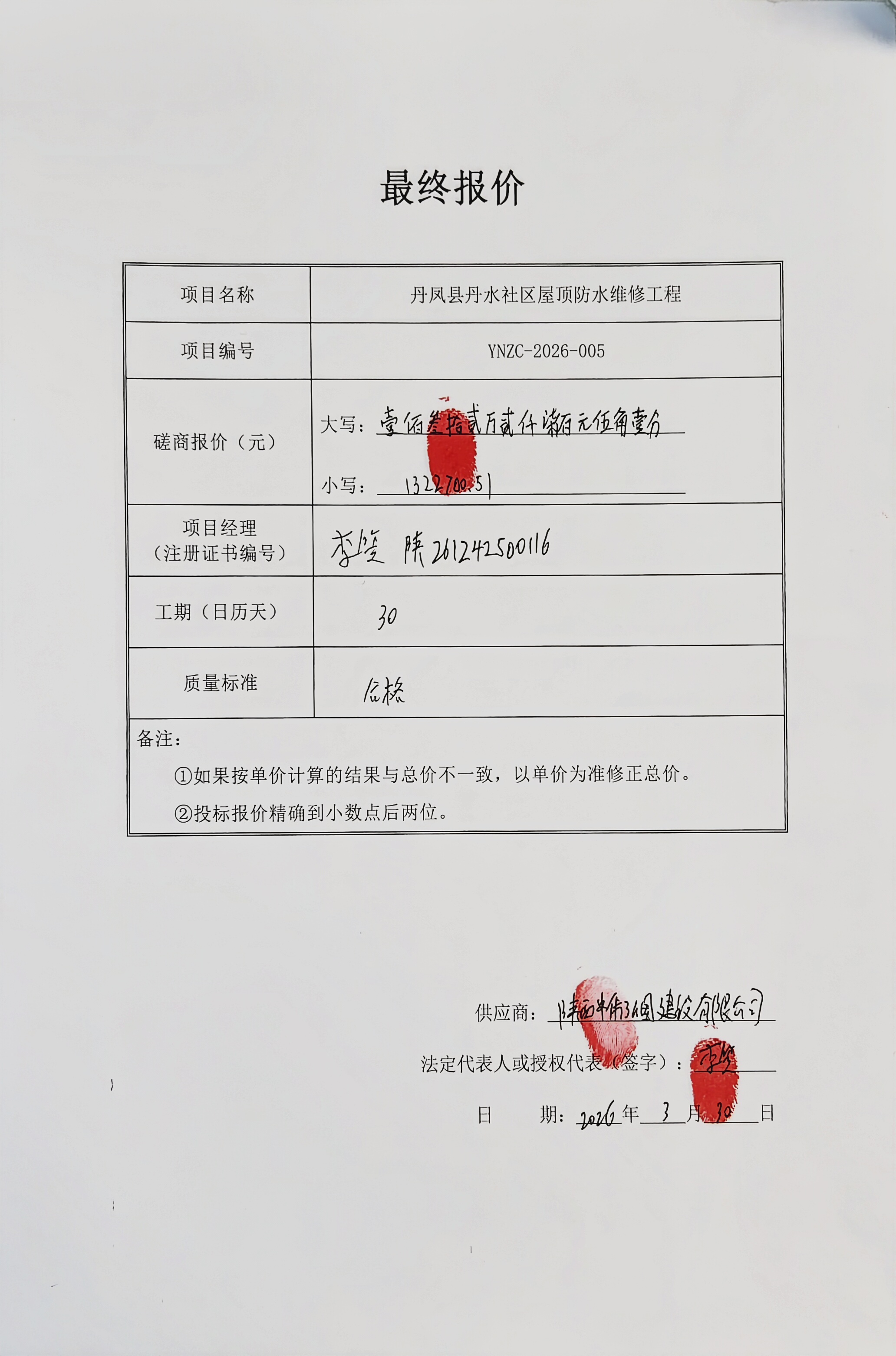 | * | 防水工程 | 丹凤县丹水社区屋顶防水维修工程 | 磋商文件包含施工范围 | 合同签订后**日历天内完成 | 李笠 | 陕************ | *,***,***.** |