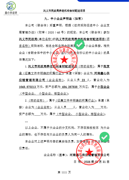 *、采购内容:通过框架协议采购方式选定*家供应商,承担巩义市民政局养老机构食材配送服务。配送内容包含:米、面、油、调味品、干货、副食品、鲜肉类、肉类冻品、水产品、蔬菜、水果、蛋、豆制品、面条、非肉类冻品等所有食材。配送范围:巩义市民政局*所养老机构,分别位于市区、小关镇、夹津口镇、康店镇(注:服务期内配送范围如有变化以实际为准)。