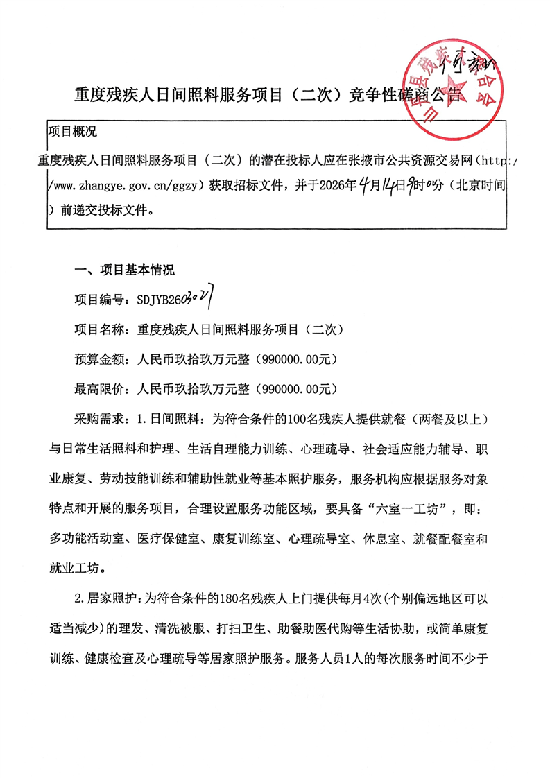 【正常公告】重度残疾人日间照料服务项目(二次)竞争性磋商公告