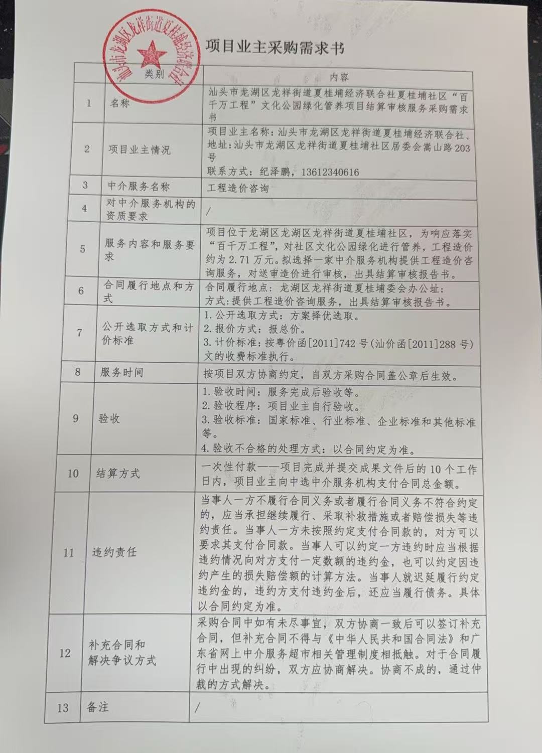 项目位于龙湖区龙湖区龙祥街道夏桂埔社区,为响应落实“百千万工程”,对社区文化公园绿化进行管养,工程造价约为*.**万元。拟选择一家中介服务机构提供工程造价咨询服务,对送审造价进行审核,出具结算审核报告书。(如果本栏目内容与采购需求书不一致,以采购需求书为准)