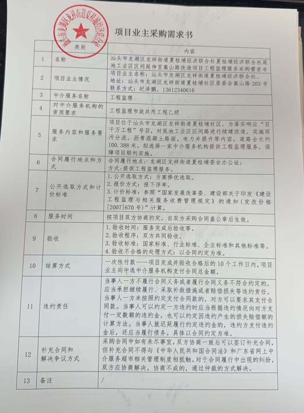 汕头市龙湖区龙祥街道夏桂埔经济联合社采购夏桂埔经济联合社尾池工业区区间延伸至嵩山路改造项目工程监理服务采购公告