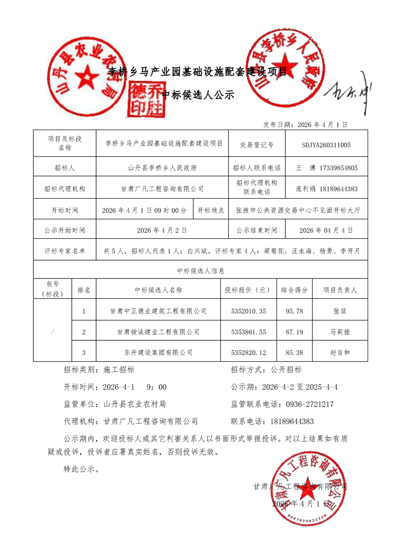 [山丹县]李桥乡马产业园基础设施配套建设项目中标候选人公示[交易结果公示]