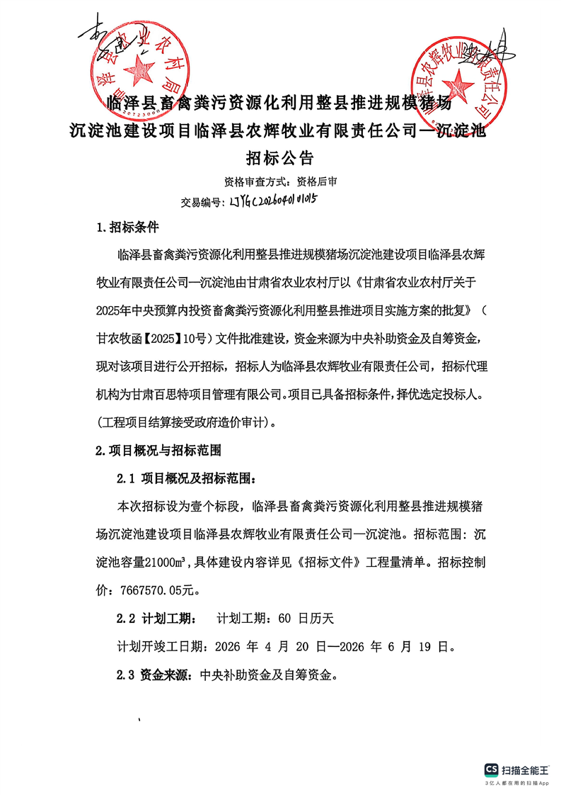 临泽县畜禽粪污资源化利用整县推进规模猪场沉淀池建设项目临泽县农辉牧业有限责任公司—沉淀池招标公告[招标/资审公告]